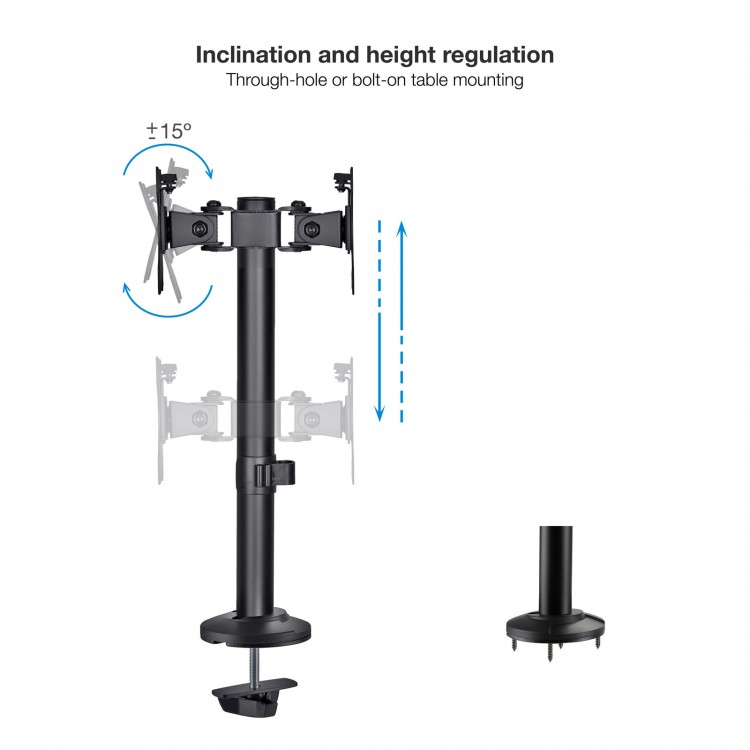 Suporte de mesa com rotação e inclinação para dois monitores ou TVs de 17" a 32". Cumpre com requisitos VESA 75x75 e 100x100. Permite uma carga máxima de 8 kg por braço. Inclinação -15º a +15º , rotação -180º a +180º e altura do braço até 399 mm.